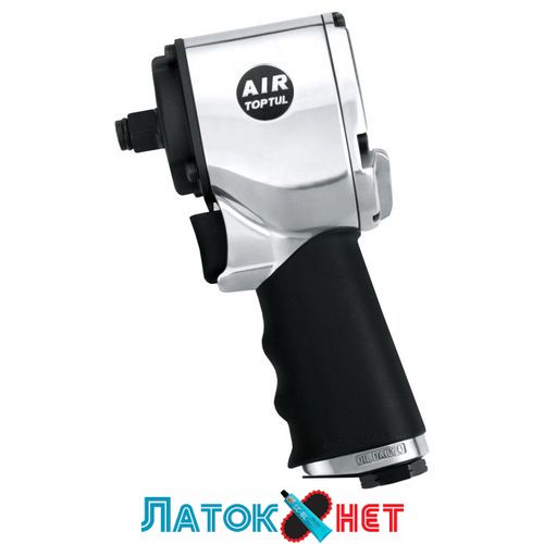 Пневмогайковерт TOPTUL KAAQ1650 (облегченный, укороченный) присоидинительный квадрат 1/2" , с максимальным создаваемым усилием 678N/m, и скоростью вращения 9500об/мин, с выводом воздуха из нижней части ручки и шумоглушителем.