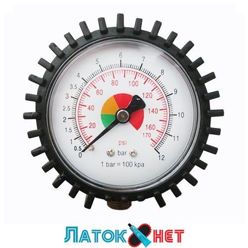 Манометр обрезиненный диаметром 60 мм служит для контроля давления при подкачивании колес и других емкостей, служит запасной частью к 81-520. Двойная градуировка шкалы: 0–12 bar и 0–174 psi.