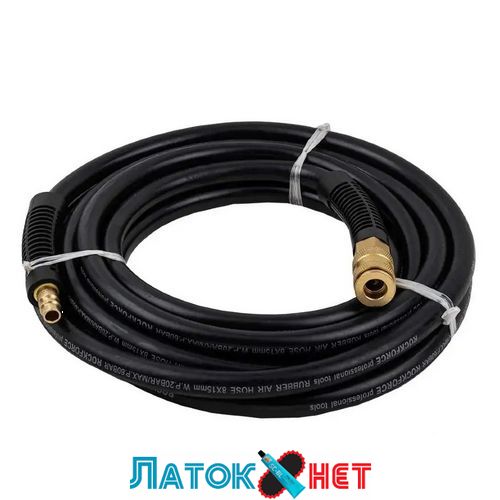 Шланг резиновый воздушный армированный с фитингами 8 x 15 мм х 5 метров ROCKFORCE RF-AHC-10/D используется для подключения пневмоинструмента к компрессору при работе с сжатым воздухом.