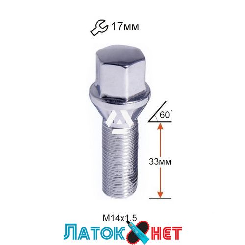Болт колісний A174130 (93733) C17D28 Cr M14X1,50X33 Хром Конус з виступом ключ 17 мм