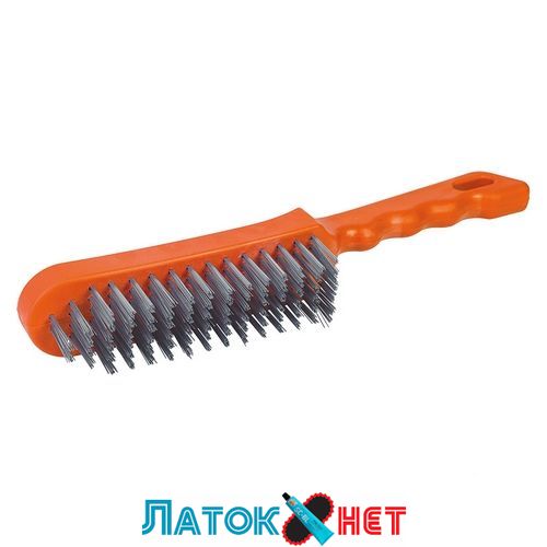 Щітка виготовлена з дроту та забезпечена ергономічною пластиковою ручкою. Використовується для очищення металевих поверхонь від фарби, іржі, окалини. Зручна в роботі, не схильна до корозії.