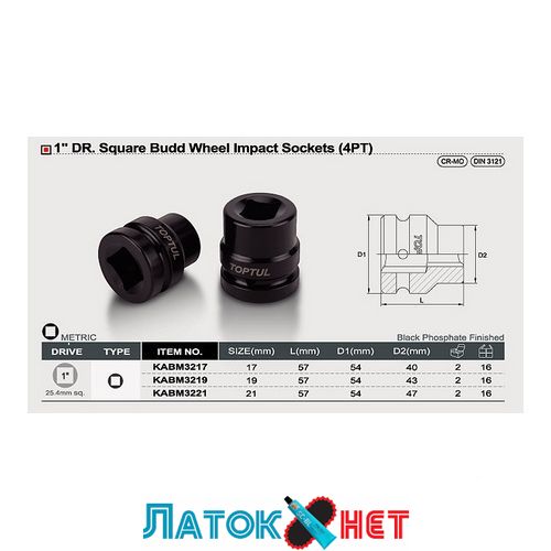 Головка ударна 1 внутрішній квадрат для футорок коліс 21 мм KABM3221 TOPTUL