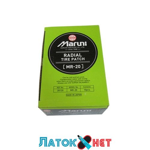 Maruni найбільший виробник радіальних пластирів у Східній Азії. Виготовлені в Японії шиноремонтні матеріали високої якості з відповідною ціною застосовують для професійного, надійного ремонту радіальних шин. Ціна на пластиру Маруні для ремонту радіальних шин залежить від форми радіального пластиру, розміру пластиру, кількості шарів корду. Здатність пластиру гнутися й спеціально підібрана гума повністю відповідають вимогам до ремонту покришок. Пластирі GNR містять пружний нейлоновий корд усередині та на краях, що дає змогу витримувати великі навантаження. - офіційний дилер, представник Maruni, надаючи гарантію, консультації та сервісне обслуговування на всю продукцію Маруні, пропонуємо Maruni понад п'ятнадцять років.